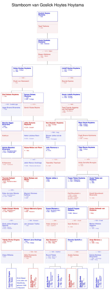 De link van de stamvader Goslick Hoytes Hoytama (geboren ca 1360) met de Walta’s en Kingma’s vind je in het schema hieronder terug. Onderaan de afbeelding vind je personen terug die ook in de buitenrand van de stamboomwaaier voorkomen.