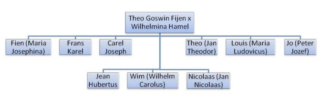 De volledige genealogie van de Fijens: Theo (Jan Th.) – Thei (Theodor Goswijn) – Carel Joseph – Theodor Goswijn – Theodor Jacob – Joannes – Goswinus is terug te lezen in de genealogie van de familie Fijen door Leo Nacken uit 2007.