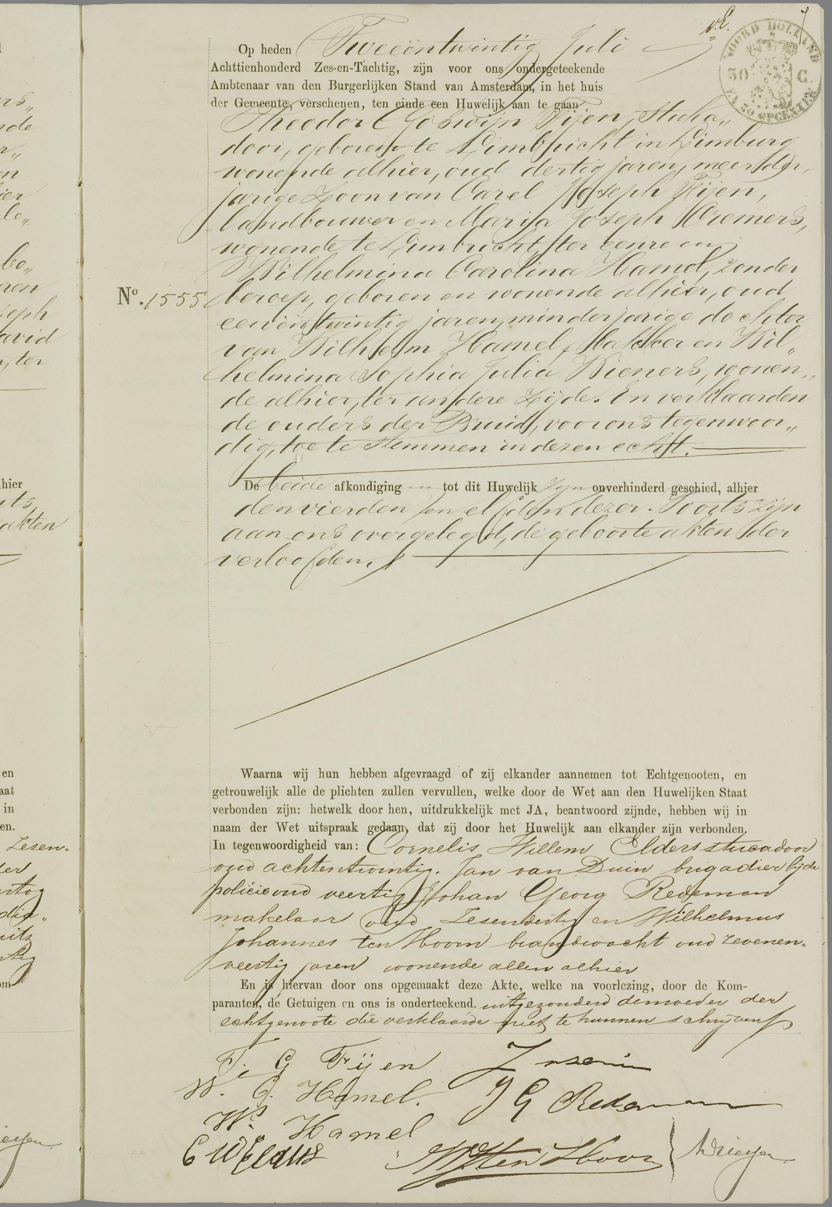 Huwelijksakte Theo Goswijn Fijen en Wilhelmina Carolina Hamel