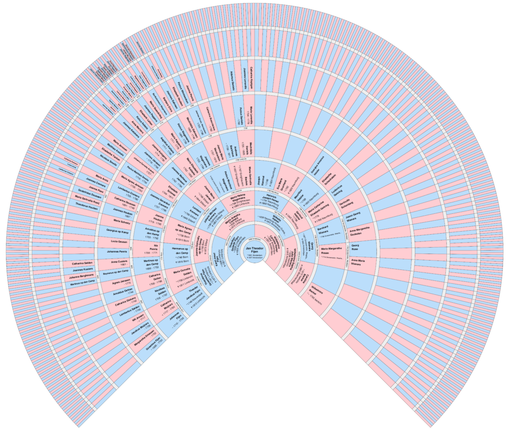 Klik op de waaier rechtsonder om de voorvaderen van Theo Fijen te vergroten of gebruik geneanet.org voor een interactieve manier om meer over deze voorouders te zien, met Theodor Goswijn Fijen als startpunt.