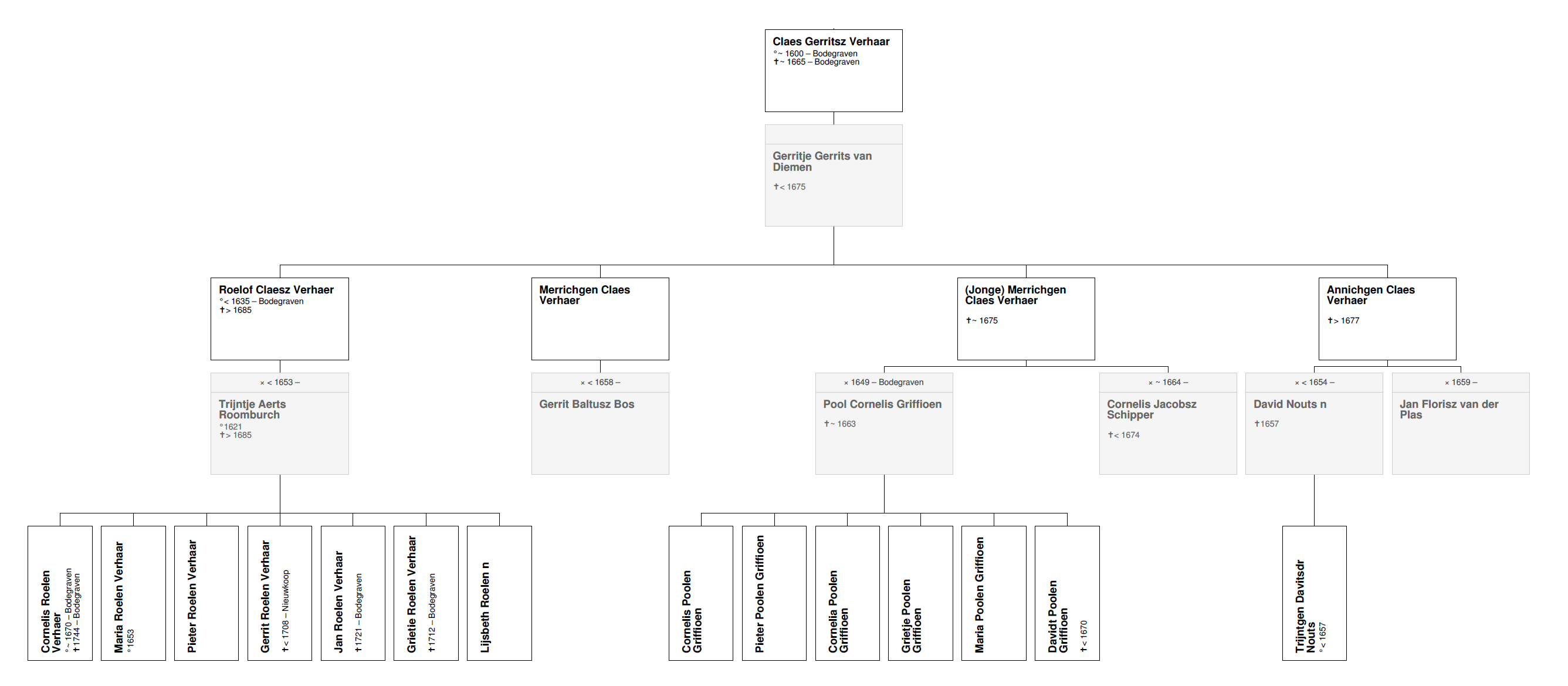 Overigens staan in het diagram hierboven 7 kinderen van Roelof en Trijntje, waarvan 2 verschillen van die in het boek van Ton Verhaar. Hij noemt niet Grietje en Lysbeth, maar Dirk en Johanna Roelen Verhaar. Echter, Johanna Roelen overlijdt 1763 in het kraambed. Zij is de vrouw van Reinier van der Lelij. Dat past bij een geboortedatum van Johanna tussen 1720 en 1745, hetgeen te oud is voor ouders die vóór 1653 getrouwd zijn. Ik vermoed dat Johanna dus van een andere generatie is. Verder overlijdt Dirk Roelen Verhaar ook in 1763 en er staat bij dat hij de zwager is van Reinier van der Lelij. Dirk en Johanna zijn dus broer en zus, maar m.i. geen zoon en dochter van Roel Claesz Verhaer. Grietje en Lysbeth, daarentegen, zijn doopgetuige bij diverse van de geboortes van hun neefjes en nichtjes, hetgeen duidt op verwantschap.
